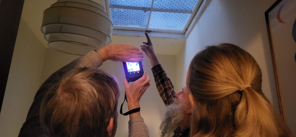 It was a very interesting and useful session led by a knowledgeable Retrofit Consultant. He set up a depressurisation test to determine airtightness and diagnose areas of leakage in the house. This was a fascinating process as bathroom and kitchen fans were taped and the fireplaces blocked as much as possible, before a powerful fan was installed to the front door to suck the air from the building. Everyone in the house could then identify where the air was entering…..amazing! In small groups we went around the home with thermal imaging cameras to look for cold areas that needed more insulation. It was surprising just how much, and where, the heat loss is occurring. In this house the chimneys, windows and window sills, were the biggest culprits! The team leading the session gave useful ideas on how to further insulate the home and reduce the heat loss: blocking chimneys, secondary glazing on windows, and more insulation in the roof space and cellar were the top tips.